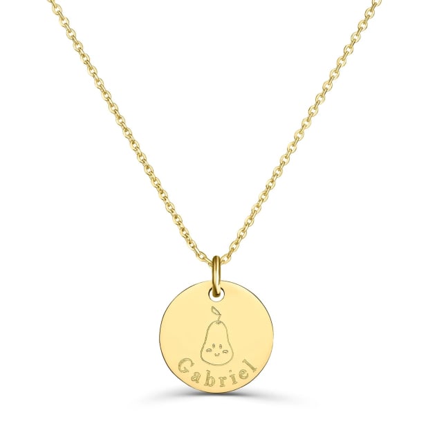 N'oubliez pas de sauvegarder votre personnalisation pour pouvoir l'ajouter au panier.Découvrez notre adorable collier personnalisé pour enfant ! Fabriqué avec amour dans notre atelier parisien, ce bijou en plaqué or arbore un charmant dessin en forme de poire. Parfait pour un cadeau de naissance, de baptême ou d'anniversaire, ce collier unique est sûr de faire briller les yeux de votre enfant, neveu ou filleul(e). Personnalisez-le avec son prénom au recto de la médaille et d'un message spécial au verso.