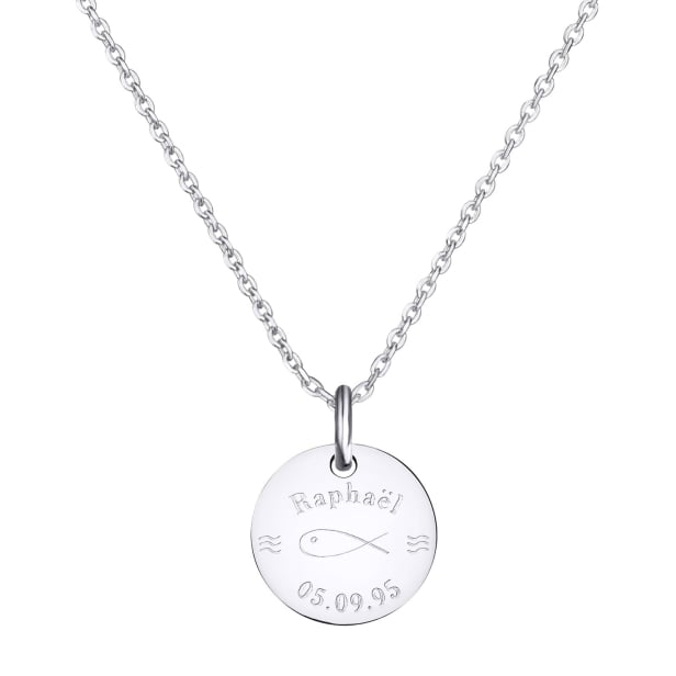 N'oubliez pas de sauvegarder votre personnalisation pour pouvoir l'ajouter au panier.Ce collier personnalisé en argent 925 pour enfants est le cadeau idéal pour les baptêmes. Ce bijou raffiné propose une médaille ornée d'une illustration Ichthus, un symbole chrétien traditionnel représentant un poisson, synonyme de foi et de protection. Il offre également une personnalisation unique vous permettant de graver le prénom et une date symbolique au recto, ainsi qu'un message plus long et discret au verso. Disponible en quatre tailles de chaîne, c'est le cadeau parfait pour marquer des occasions spéciales avec un souvenir durable et significatif.