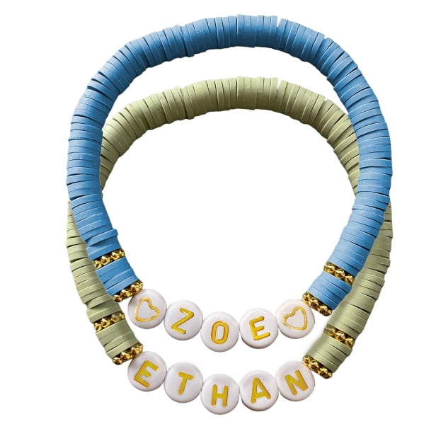 N'oubliez pas de sauvegarder votre personnalisation pour pouvoir l'ajouter au panier.Un duo de bracelets personnalisés élastiques pour une femme et son enfant, composé de perles de lettre blanches et dorés et de perles heishi. Très tendance il se porte été comme hiver, seul ou en accumulation. Nos bracelets personnalisés "Jaipur" sont faits à la main dans notre atelier parisien.