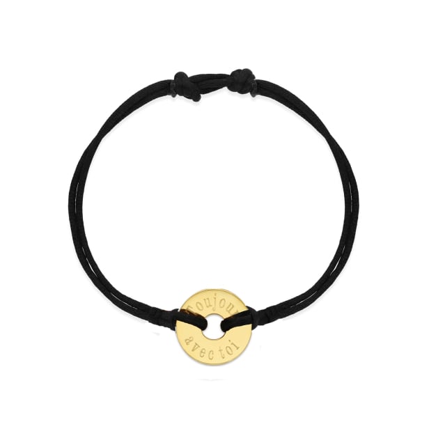 N'oubliez pas de sauvegarder votre personnalisation pour pouvoir l'ajouter au panier.Tendance et personnalisable, ce bracelet n'attend que vous pour s'offrir une dimension symbolique. Choisissez la couleur de son lien et dictez-nous les inscriptions à graver sur son médaillon cible en Plaqué Or. Faites de ce cordon un bijou qui vous ressemble ou témoignez votre affection envers une femme qui vous est chère. Ne vous souciez pas de la taille, les nœuds coulissants permettent à ce bracelet de s'adapter à toutes les tailles de poignets.
