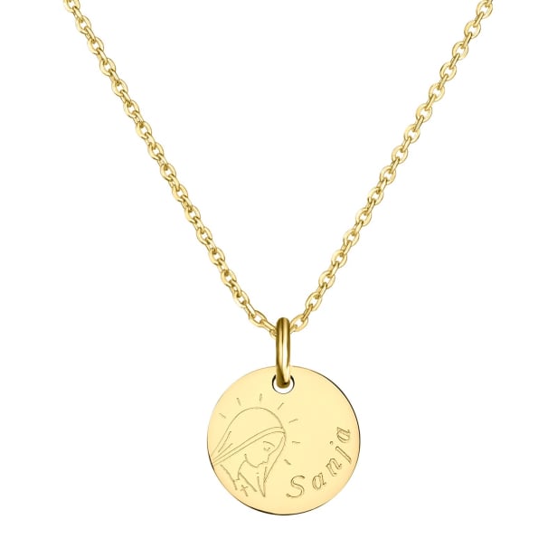 N'oubliez pas de sauvegarder votre personnalisation pour pouvoir l'ajouter au panier.Élégant et symbolique, notre collier de baptême en plaqué or pour enfant "Vierge Marie" est parfait pour commémorer un baptême. Ce bijou intemporel, personnalisable avec le prénom de l'enfant au recto et un message spécial au verso, incarne l'amour et la protection divine. La médaille délicate de la Vierge Marie symbolise la foi et la bénédiction, en faisant un choix significatif et mémorable pour célébrer cette importante étape de la vie d'un enfant.