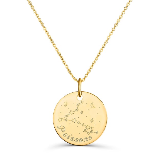 Moments Précieux à réfléchi, imaginé, dessiné à Paris chaque signe afin de vous proposer des bijoux 100% personnalisés et uniques. Rappelez-lui combien vous la connaissez en lui offrant ce médaillon astro. La constellation du Poisson sera gravée, avec le plus grand soin, au recto. Pour accompagner la constellation vous avez la possibilité d'inclure soit le mot "Poisson", soit un prénom, soit un mot cher à vos yeux. Au verso, vous avez la possibilité de graver vos inscriptions personnalisées. Un prénom, une date, des initiales, un joli motif ou un petit mot tendre, faites de ce collier en plaqué or un bijou très spécial.